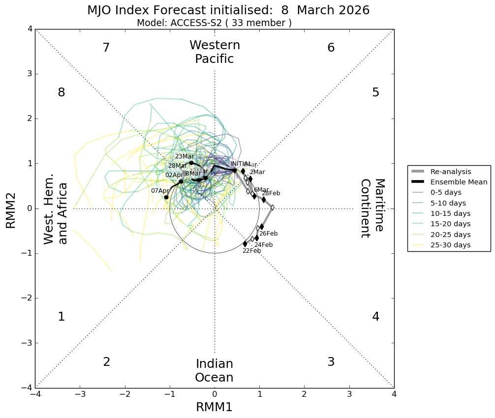 Over the coming few weeks, rainfall probabilities remain relatively balanced, with much of the Basin sitting near historical averages for the chance of exceeding median rainfall. Atmospheric conditions are currently being influenced by the Madden-Julian Oscillation (MJO), which is positioned in Phase 7 and forecast to progress into Phase 8 in the coming weeks. Historically, this phase progression is less supportive of rainfall across eastern Australia during the late summer to early autumn period, often favouring drier conditions across southern catchments.