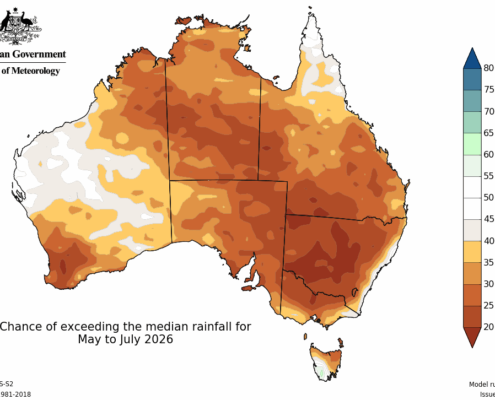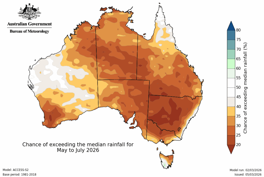 Seasonal outlook guidance reinforces this emerging bias. Forecast modelling indicates that much of southern Australia is likely to experience below-average rainfall probabilities through April, with large parts of the Murray-Darling Basin showing only around a 30-40% chance of exceeding median rainfall. This dry signal strengthens further when looking beyond the immediate outlook.